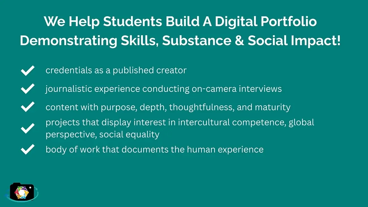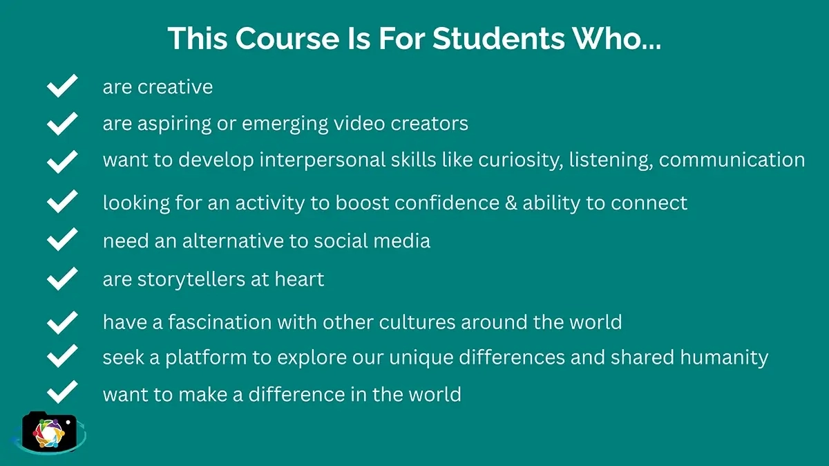 This course is for creative, altruistic high school and college students who want to make an impact and are ready to get started as video creators. Eligibility: