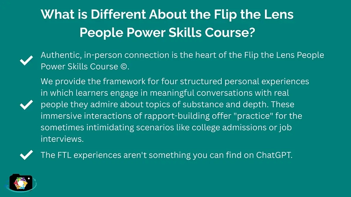 With the Flip the Lens (FTL) People Power Skills curriculum, learners conduct and film in-person interviews with people they identify as role models on the topics of belonging, creativity, and culture. They will also create a mini documentary of a “Day in the Life” of someone they admire.